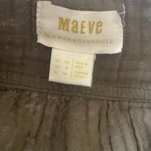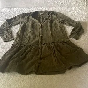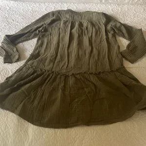 Maeve for Anthropologie gauze style dress. Army green. Can be worn with leggings and tall boots in the winter or as is in the summer, very versatile. I’m 5’4” and hits mid thigh