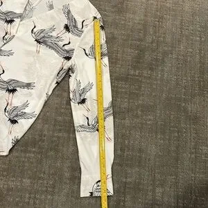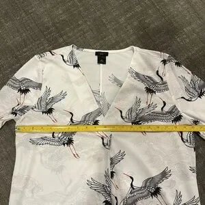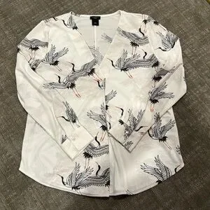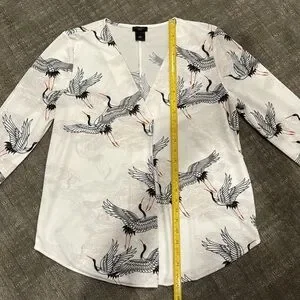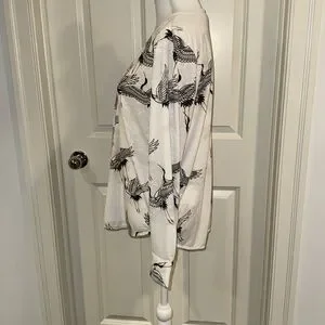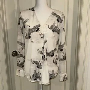 Nice and fun flying cranes V-neck long-sleeve blouse with 2 button cuff and pleated front for room and drape. 100% polyester, machine wash cold. There is a little bit of stretch to the fabric. Flattering g shirt tail hem. The color is more of a soft white. Measurements in photos. Excellent condition. No rips or stains.