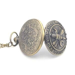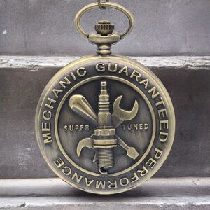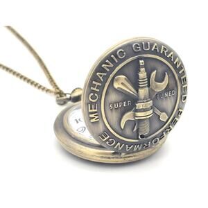 This unique pocket watch features a vintage bronze finish and is adorned with intricate mechanical-themed details. The front showcases an emblematic design with a spark plug at the center, surrounded by essential mechanic tools, including a wrench and screwdriver. The words "MECHANIC GUARANTEED PERFORMANCE" encircle the design, emphasizing reliability and precision. The watch is crafted with a rugged, industrial aesthetic, making it an ideal accessory for automotive enthusiasts and professionals alike.