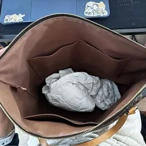This stylish tote is crafted of Louis Vuitton monogram coated canvas. The bag features patch pockets on either side and vachetta cowhide leather trim and shoulder straps, with polished brass hardware. The top zipper opens the bag to a cocoa brown fabric interior with patch pockets.