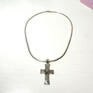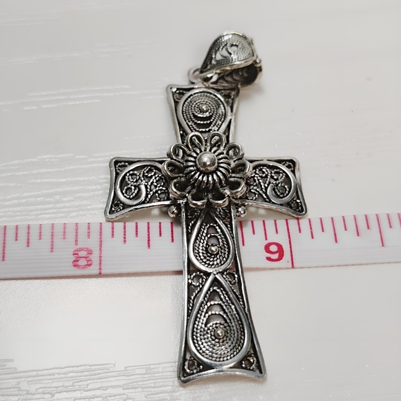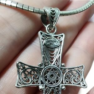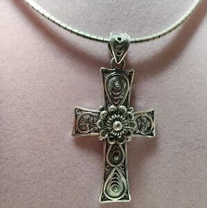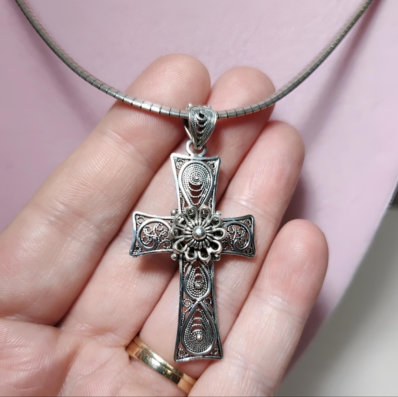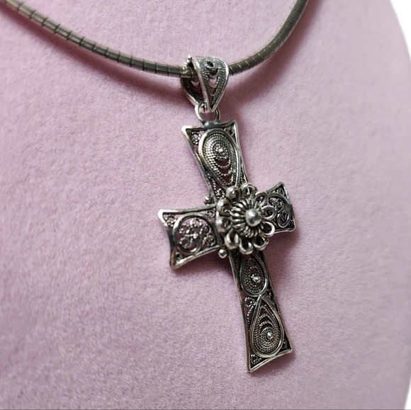 DGS Turkey Sterling Silver Large Telkari Filigree Cross with Omega Chain