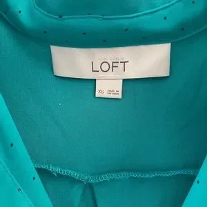 LOFT sleeveless collared blouse size XS, 100% polyester, teal with navy or black dots, machine washable, 2 front pockets, v-neck, cool & comfortable, lightweight