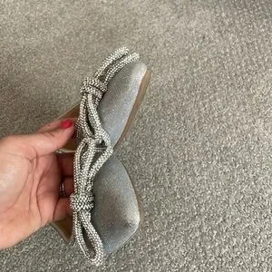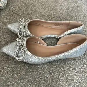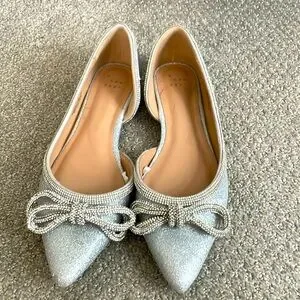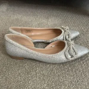 Super flattering sparkling sliver flats with double bow at pointed toe. In great condition worn 2X for a few hours to parties.