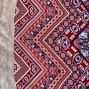 Tank top “cardigan” with pattern at bottom. Knit top. Super cute and supposed to be on the longer side can fit variety of sizes. Tan top and reddish patterned bottom