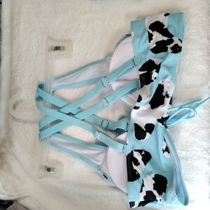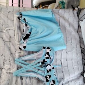 black and white cow print with blue top has adjustable straps on the back that criss cross and the skirt has a adjustable tie on the side