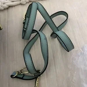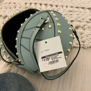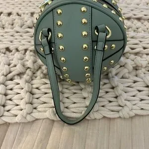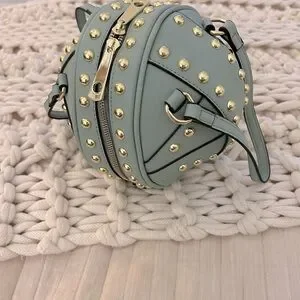 Mint green ball studded zipper bag. 10” wide. Brand new with tags. Gold rivets/ nailheads. Comes with detachable long strap.
