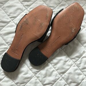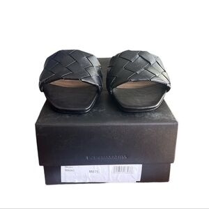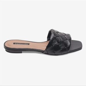 Chic modern slide. Basketweave leather, padded footbed, .5” heel. Worn slightly.