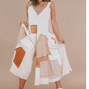 Elevate your boho style with this stunning jumpsuit from Oli and Hali. The patchwork design adds a unique touch to this one-piece, while the cream color compliments any skin tone. With its comfortable fit and stylish design, this jumpsuit is perfect for any occasion and is a must-have for any fashion-forward woman. Whether you're dressing it up for a night out or keeping it casual for a day of running errands, this jumpsuit is sure to turn heads. Don't miss out on the opportunity to add this Oli and Hali patchwork jumpsuit to your wardrobe.