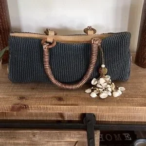 Absolutely Stunning Coastal woven bag with a beaded shell Tassel (beach theme) bag is in new condition inside is lined in green color a must see bag for any occasion color of the bag is blue with brown and beige handles