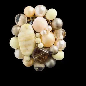 Vintage Oval Gold Tone, Light Yellow, Orange, Tope and Off White Beaded Clip On Earrings. They are signed Japan.