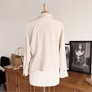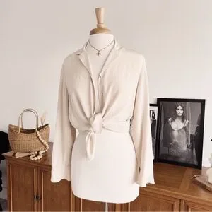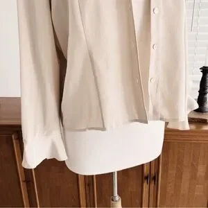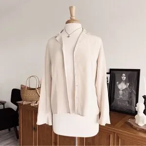 Beautiful 100% Silk Button Down vintage top. The sleeves have a dainty bell sleeve flair. Such a perfect top to wear on its own or use it to layer over other tanks and swimsuits. Great for the warmer months!