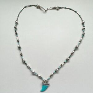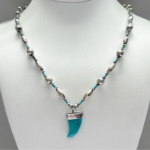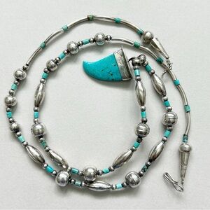 Vintage Southwestern Turquoise Bear Claw Bead Sterling Silver Necklace. Blue turquoise bear claw with sterling silver cap on strand of sterling silver round bench and tube beads with turquoise spacers. Hook and loop clasp. May be Navajo. Necklace is 23 inches. Turquoise claw is 15 x 18 mm. 18g