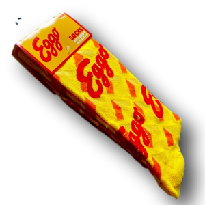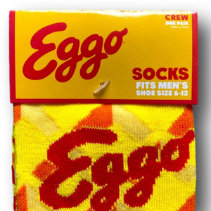 Funny Novelty Crew Socks. Eggo Waffles logo design. Yellow, red, & orange colors. 97% Polyester, 3% spandex. Brand new with tags attached. Great for gifts or stocking stuffers!
