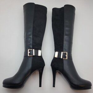 Classy black  faux leather and faux suede tall boots with 4 inch pin heel and  decorative gold buckle. Side zipper goes all the way down for easy on and off. These go well dress or skirt. Calf too narrow for most to fit over pant or jeans.