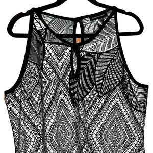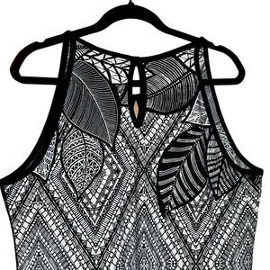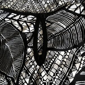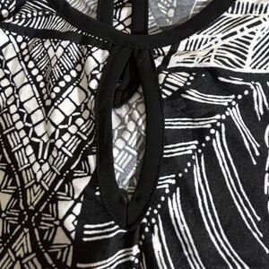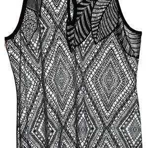 This stunning Ashley Stewart maxi dress features a classic black and white geometric pattern that is perfect for any occasion. The dress is made with a comfortable and lightweight polyester-spandex blend that is both stretchy and machine washable. The sleeveless design and keyhole neckline add a modern touch to the classic design. It also has a 20” left side bottom slit.