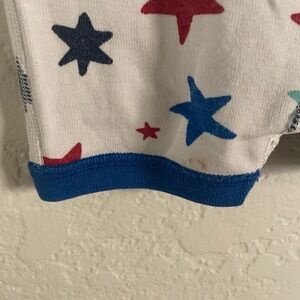 Hanna Anderson Shortie, size is 12-18 months. Stars are red and different shades of blue. Has a zipper and snap covering at neck. There is staining throughout the sleeper as shown in pictures. Still has lots of life left and would be great for summer and warmer days/nights.