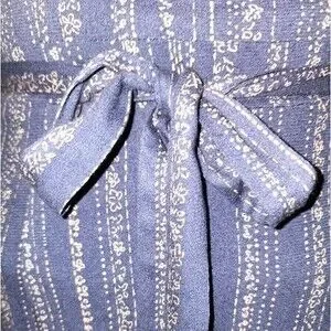 Sadie & Sage Anthropologie Blue & Tan Ruffled V-Neck A-Line Mini Dress Size S. This lovely dress is a soft, powdery blue with vertical lines of tan floral print on fabric that is 100% rayon. The cap sleeves are ruffled and there is a 2 to 3 inch ruffle around the bottom hem. The waist has a narrow fabric sash that ties in a bow in the back. The dress has a zipper under the left arm for easy on and off. This dress is preowned but remains in very good condition with no flaws noted. Approximate measurements lying flat: armpit to armpit 18", waist 14.5", length from shoulder to bottom hem 32".