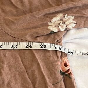 Dusty Mauve in color (some pictures show as a tan color but true color in main pic) Floral print, eyelet details on front and on sleeves. Long sleeves with elastic cuffs. Deep V-Neck