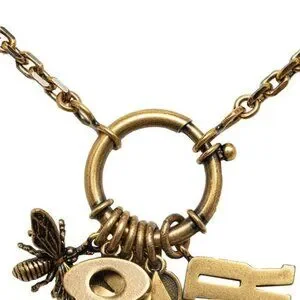 The unmistakably trendy Dior logo is tastefully attached, serving as a tasteful reminder of the brand's distinguished reputation and prestige. This uniquely crafted necklace boasts exceptional finishing in glossy gold tone, which romantically complements the soft curves of the charms. The chain comfortably measures a perfect length, ensuring the charms settle gracefully around the neck. Each charm is carefully articulated, which allows the necklace to move freely, catching and reflecting the light to reveal intricate detailing and creating an entrancing sparkle.