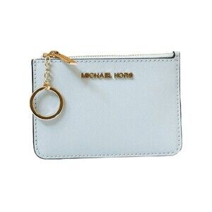This Michael Kors card wallet in Vista Blue is the perfect addition to any women's accessories collection. Made of high-quality leather with a solid pattern and accented with a zipper, this wallet is both stylish and functional. It features a zip-around closure and includes credit card slots, making it easy to keep your essentials organized. The small size allows for easy portability, making it perfect for both everyday use and travel. Whether you're running errands or going out on the town, this wallet has got you covered.
