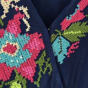 Floral embroidered cross stitch front neckline and sleeves.