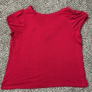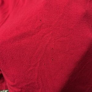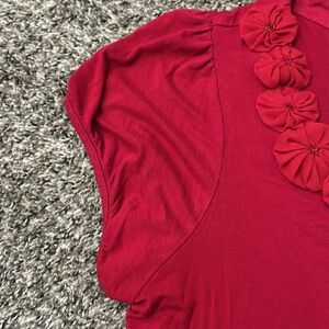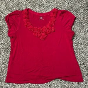 Super cute and soft red shirt with adorable flower details along the neck line. Only worn a handful of times however there are tiny holes on the front from cat claws (last photo). Women’s 14/16 from dress barn