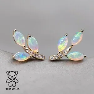 Olive Branch Leaf Design Australian Solid Opal Diamond Stud Earrings 14K Yellow Gold.