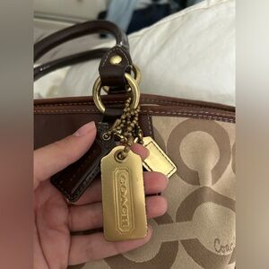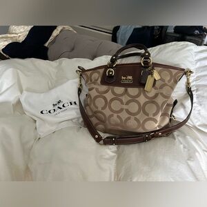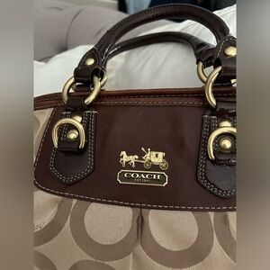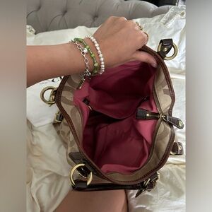 Beige and dark brown Coach purse in excellent condition with minimal signs of wear. Has a longer strap that can be attached and pink interior.