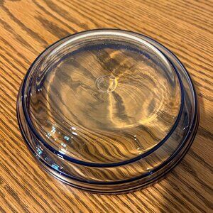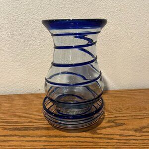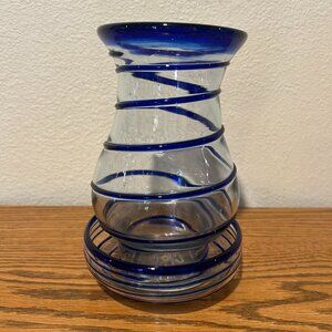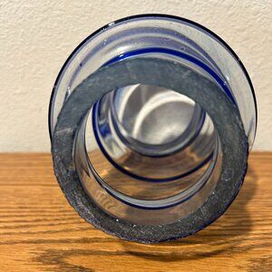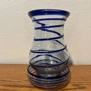 Beautiful clear glass with blue swirls running through it. Two pieces together are abour 7.5" tall, base is 15.5" in diameter. Pre-owned, no cracks, or chips and marks are from when it was made.