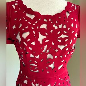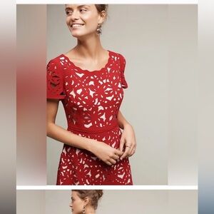 This dress retailed for 188 at Anthropologie. Such a feminine yet fashionable look! Dress is lined in flesh color, and the garnet red top layer has a cut out detail. Round neck, short sleeves and full skirt. Fitted waist. Back zipper.