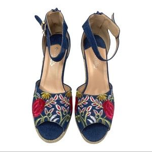 Beautiful Blue Denim open toe ankle strap espadrilles with a floral embroidered pattern in red and gold. Zippered back for easy off and on. _ platform with a _ heel height. Dress up or down. Pair with your favorite jeans or denim dress for a timeless and classic look.
