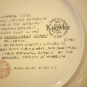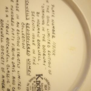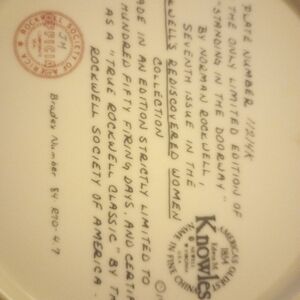 This collector plate is the 7th in the Rockwell’s Rediscovered Women series by Edwin M. Knowles Fine China in Newell, WV. Only limited edition; numbered 11214K. Measures 8.5 inches in diameter. No original box. Gently displayed; no chips or cracks.