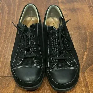 Finn Comfort Women’s Soho-S Leather Sneaker in Size 40 (Euro Size), US 9. Black Shimmer, black points/nappa seda. Removable footbed made of suede leather, jute, and cork. Heel height 12 mm. Great used condition. Small scratch on toe. See pictures.