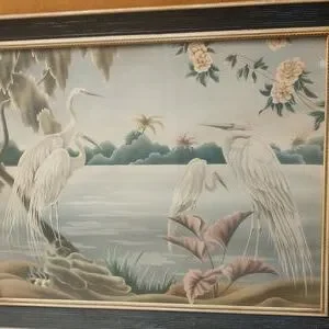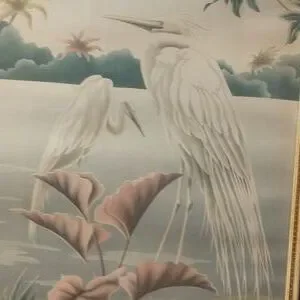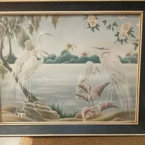 beautiful Turner print of white herons . this print is in excellent condition, it comes in an original frame, and is from the 40's - 50's. the frame has some damage that has been painted over as shown in photos. it is limited to the right and bottom rails. a little fresh paint and a little work could make it unnoticeable. it is in overall great condition and would look elegant in a living room situation.