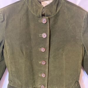 Dark Green 100% Suede Leather Mandarin size 4 collar 6 Buttons on Front. Pre owned worn once no holes odors very minor water dried up stain at the top on back does not take away from this jacket still being in great condition. Collar to hem length 23” pit to pit 20”