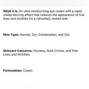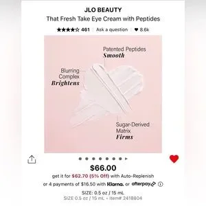 JLO BEAUTY THAT FRESH TAKE EYE CREAM WITH PEPTIDES - BRAND NEW! An Ultra- Moisturizing eye cream with a rapid visibly blurring effect that reduces the lines and wrinkles for a refreshed rested look! This is my back up one. I have so many eye creams I want to try I have to start picking which ones to let go of. Eye creams last so long because you only need a little dab for each application!