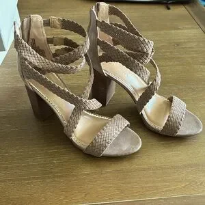 Taupe colored suede woven straps, wood colored blocky heel, cream and gold memory foam lining.