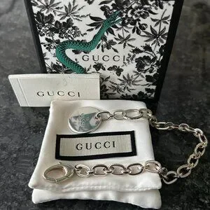 Elevate your jewelry collection with this exquisite Gucci Trademark Logo Round Charm Bracelet. Crafted from high-quality 925 sterling silver, this elegant bracelet features a round charm with the iconic Gucci logo. The charm is complemented by a stylish charm bracelet with a length of 7.5 inches, making it the perfect accessory for any occasion. Ideal for collectors and fashion enthusiasts alike, this bracelet exudes sophistication and class. Its unique design and superior craftsmanship make it a timeless piece that will enhance any outfit. Don't miss out on the opportunity to own this stunning Gucci charm bracelet today.