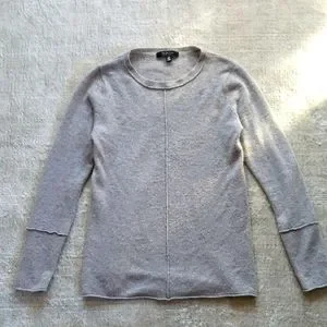 Fitted cashmere sweater by Saks Fifth Avenue has long sleeves and jewel neckline. Soft 100% cashmere in taupe color. Size large. Measures 18 inches across chest from pit to pit. Body length is 24 inches from shoulder to hem.