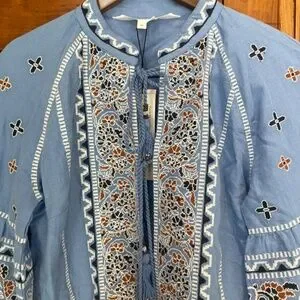 Linen and cotton blend Rivoli jacket. All over embellishment, balloon sleeves and long tassels