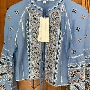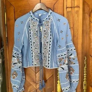 Veronica Beard Rivoli Cropped Embroidered Tassel Tie Balloon Sleeve Jacket