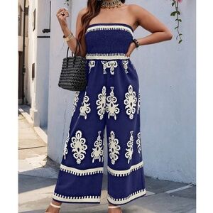 Boho Baby Blue Shirred Bodice Strapless Wide Leg Jumpsuit