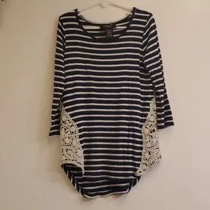 Blue and off white striped 3/4 sleeve shirt with off-white embroidery. Super soft and cozy.