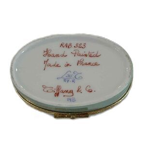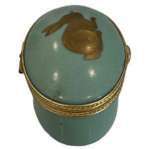 Beautiful antique trinket featuring a gold bunny with gold trim backed by teal. Embellishments around the gold trimmed sides. Gold carrot on bottom of lid. Latch open and closes perfectly. Hand painted in France. Measures 2.4" long, 1.5" wide and 1.2 tall