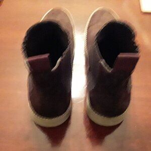 H & M dark brown/faux suede men size 7.5 chelsea boots w/elasticized side panels and loop at back, pre owned, slight scuff otherwise great condition