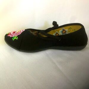 Description: Women's Black Canvas Ballet Flats with Embroidered Chrysanthemum Flowers