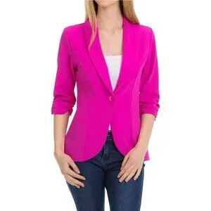 Elevate your work wardrobe with this stylish women's 3/4 sleeve ruched lightweight blazer jacket. Perfect for the office, this versatile blazer features three-quarter ruched sleeves and an open front with a single button closure. The draped design adds a touch of elegance while ensuring comfort throughout the day. Made from lightweight material, this blazer is ideal for year-round wear, keeping you cozy without feeling bulky.