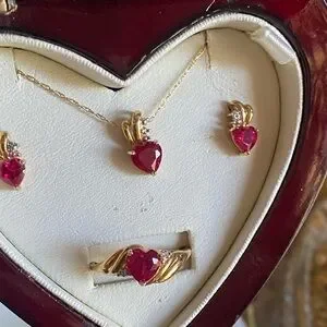 10k yellow gold, diamonds and pink sapphires jewelry set in heart box