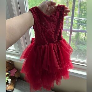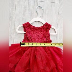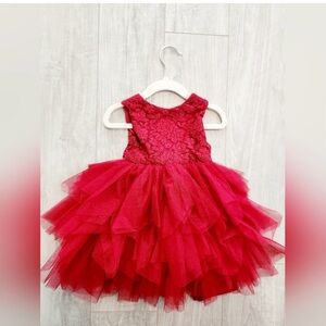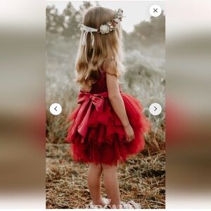 The madeleine dress has gorgeous lace bodice, fluffy tutu tulle and it’s sleeveless. V cut on the back. The dress has a gorgeous satin belt to tie like a holiday bow. Size 12-18 months. Only worn once for the photoshoot. Excellent condition.
