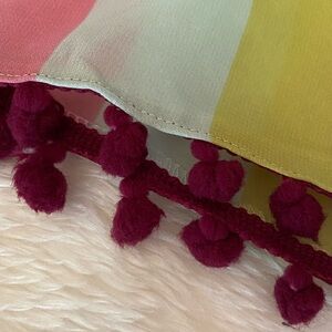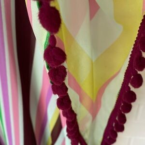 Pom-pom fringe with a V-neck Poncho/Caftan style with designated arm holes